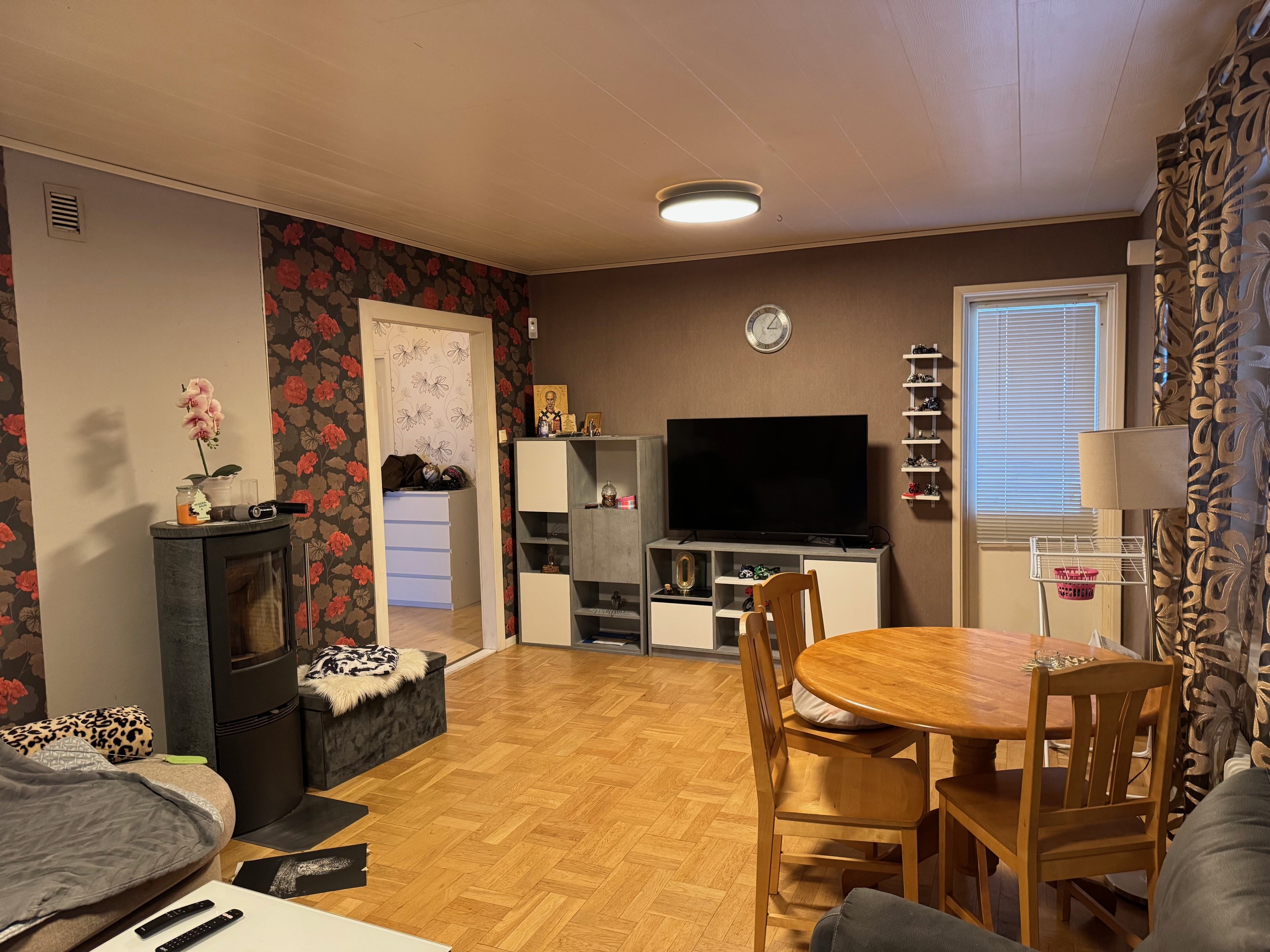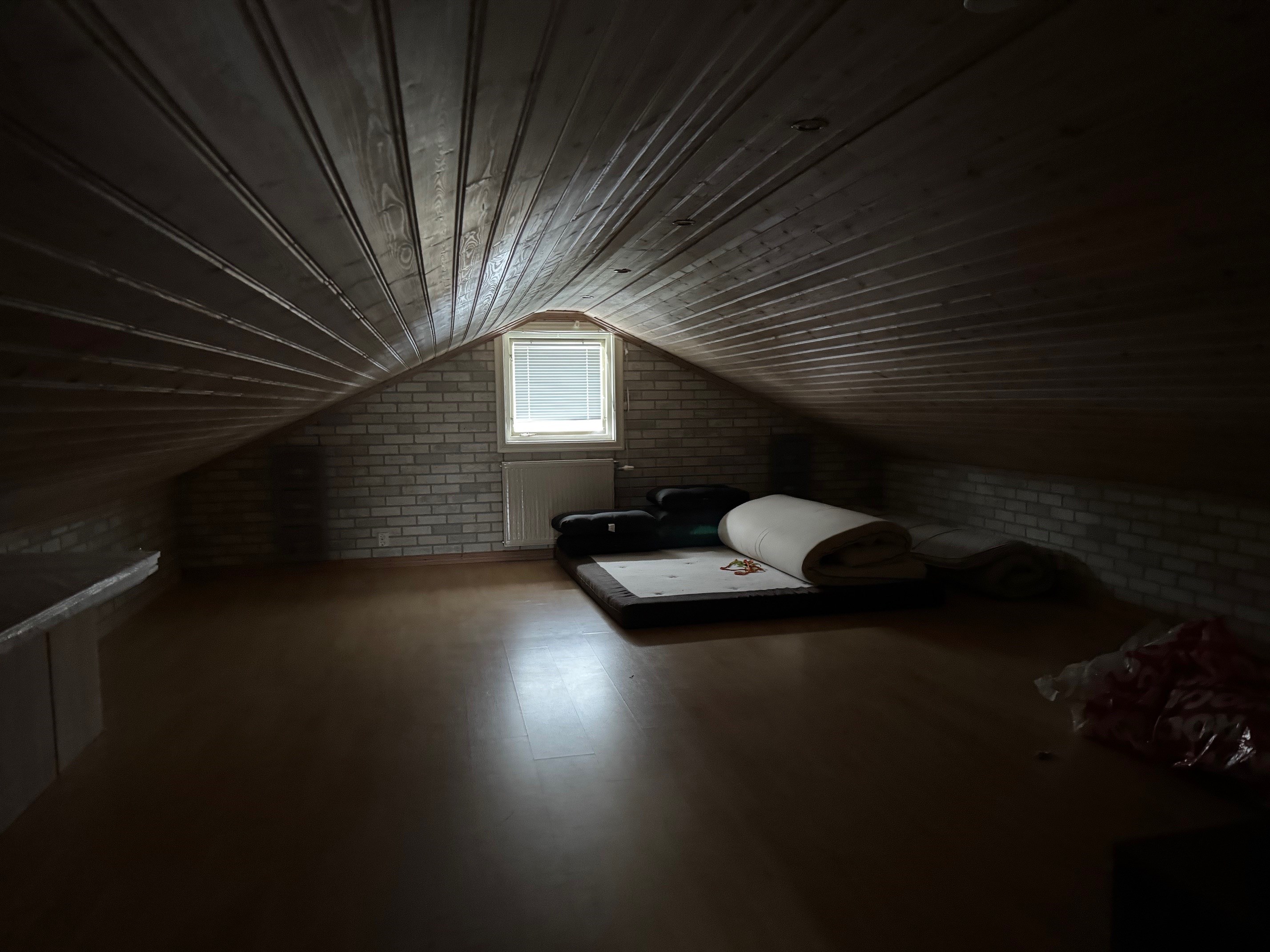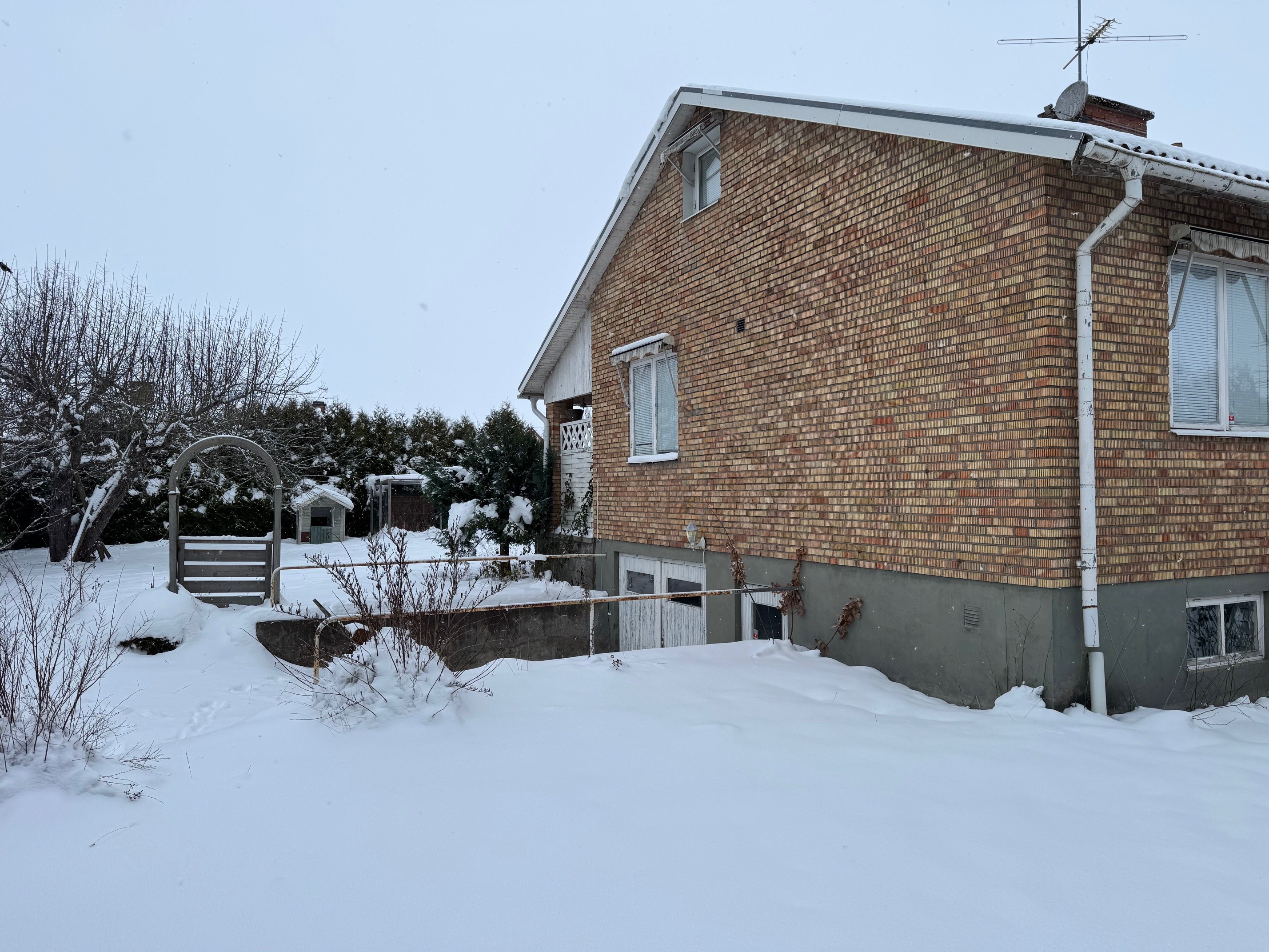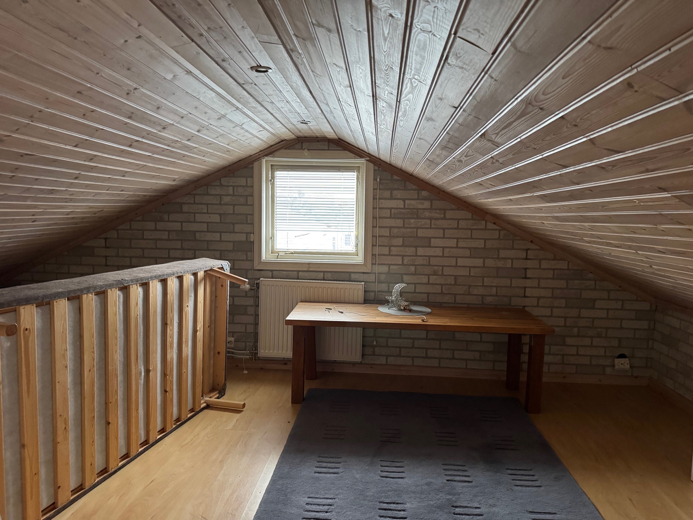 Enplanshus med källare och inredd vind. Via entrén kommer man in i hallen som leder vidare till övriga rum. I anslutning till hallen finns badrum med wc, tvättställ och duschkabin. Vidare in i bostaden nås två sovrum med plats för säng och förvaring. Vardagsrummet är rymligt och ljust med parkettgolv och täljstenskamin som ger både värme och trivsel. Härifrån finns utgång till altan som förlänger bostadens sällskaps ytor under sommarhalvåret. Köket ligger i anslutning till vardagsrummet och är utrustat med spis (häll), fläkt, mindre diskmaskin, kylskåp, skafferi samt bänkar och skåps förvaring. Den inredda vinden nyttjas som sovalkov och erbjuder extra utrymme med låg takhöjd. Källarplanet rymmer wc med tvättställ samt badrum med jacuzzi, båda med kakel och klinker. Här finns även tvättstuga med tvättmaskin och varmvattenberedare, uppvärmning via bergvärme Nibe, förrådsutrymmen samt garage. En bostad som kombinerar funktionella ytor med flera bekvämligheter och goda möjligheter för både vardagsliv och förvaring.