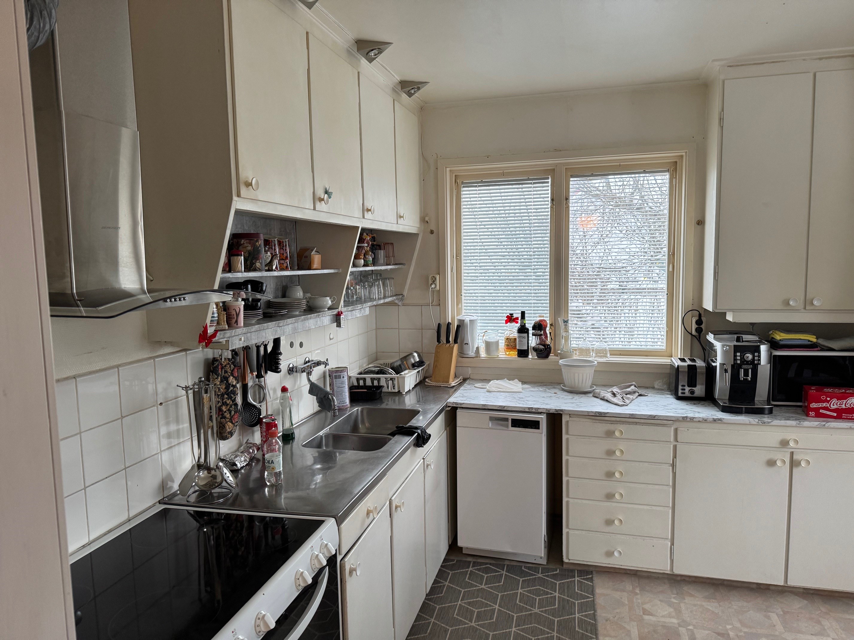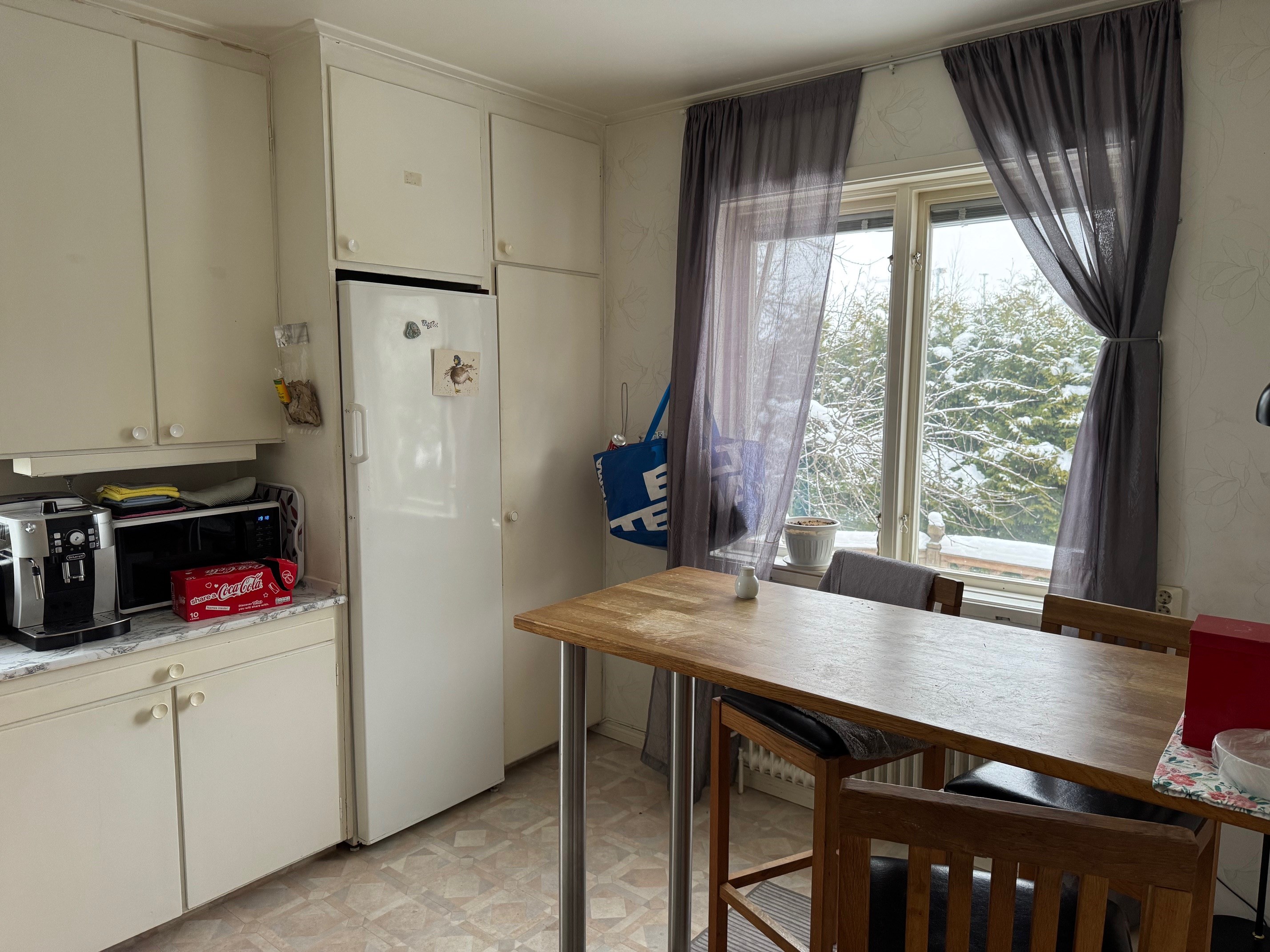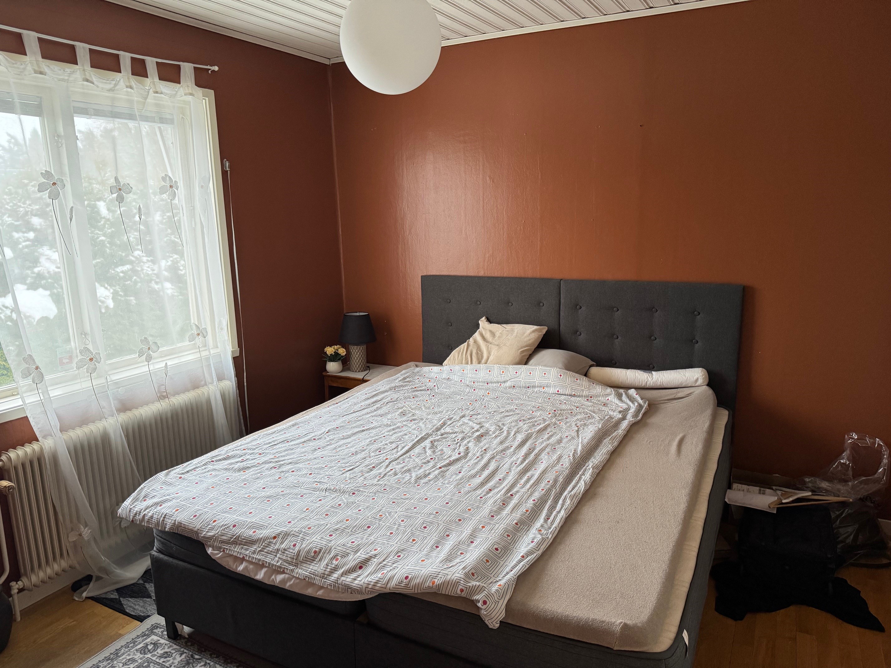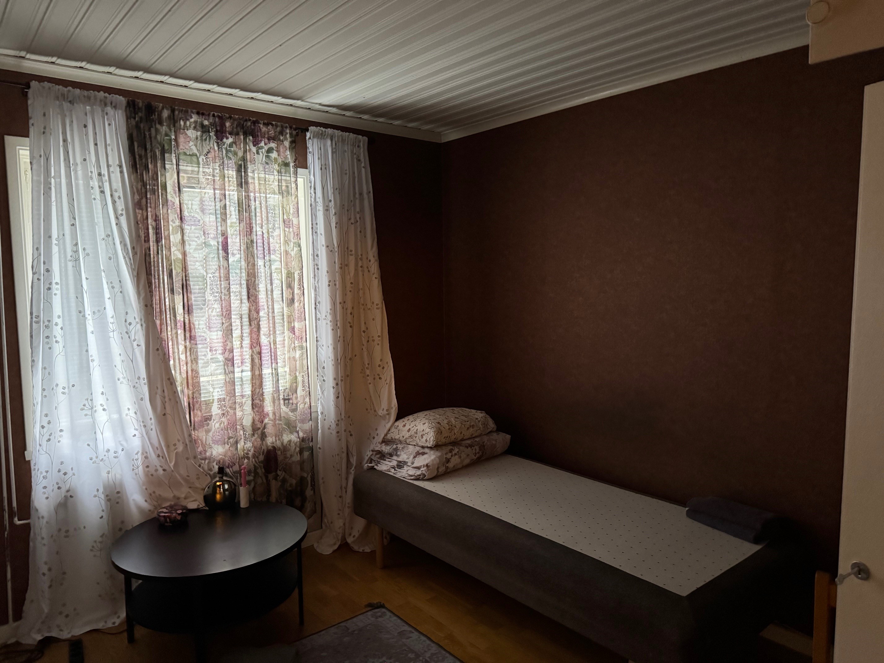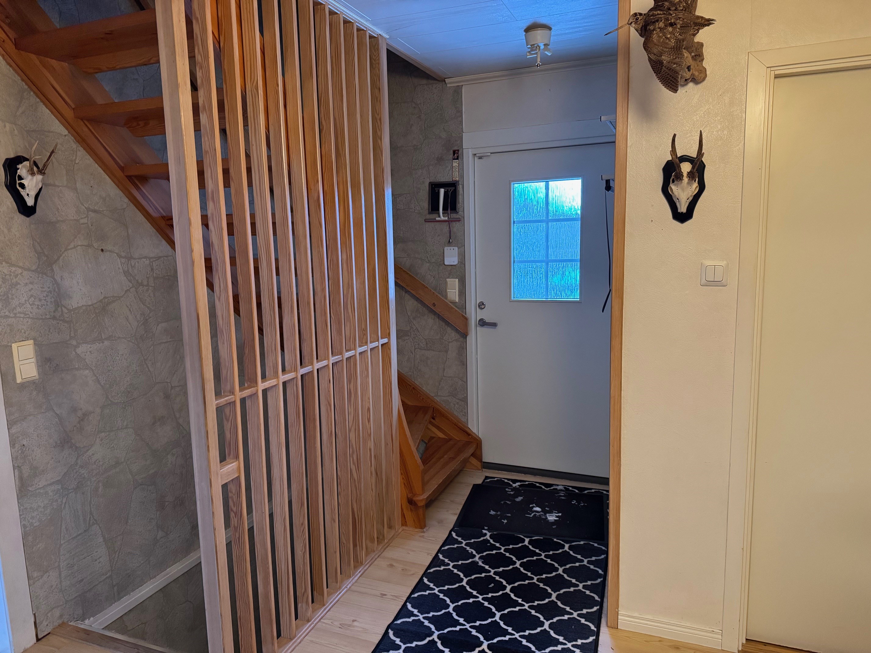 Enplanshus med källare och inredd vind. Via entrén kommer man in i hallen som leder vidare till övriga rum. I anslutning till hallen finns badrum med wc, tvättställ och duschkabin. Vidare in i bostaden nås två sovrum med plats för säng och förvaring. Vardagsrummet är rymligt och ljust med parkettgolv och täljstenskamin som ger både värme och trivsel. Härifrån finns utgång till altan som förlänger bostadens sällskaps ytor under sommarhalvåret. Köket ligger i anslutning till vardagsrummet och är utrustat med spis (häll), fläkt, mindre diskmaskin, kylskåp, skafferi samt bänkar och skåps förvaring. Den inredda vinden nyttjas som sovalkov och erbjuder extra utrymme med låg takhöjd. Källarplanet rymmer wc med tvättställ samt badrum med jacuzzi, båda med kakel och klinker. Här finns även tvättstuga med tvättmaskin och varmvattenberedare, uppvärmning via bergvärme Nibe, förrådsutrymmen samt garage. En bostad som kombinerar funktionella ytor med flera bekvämligheter och goda möjligheter för både vardagsliv och förvaring.